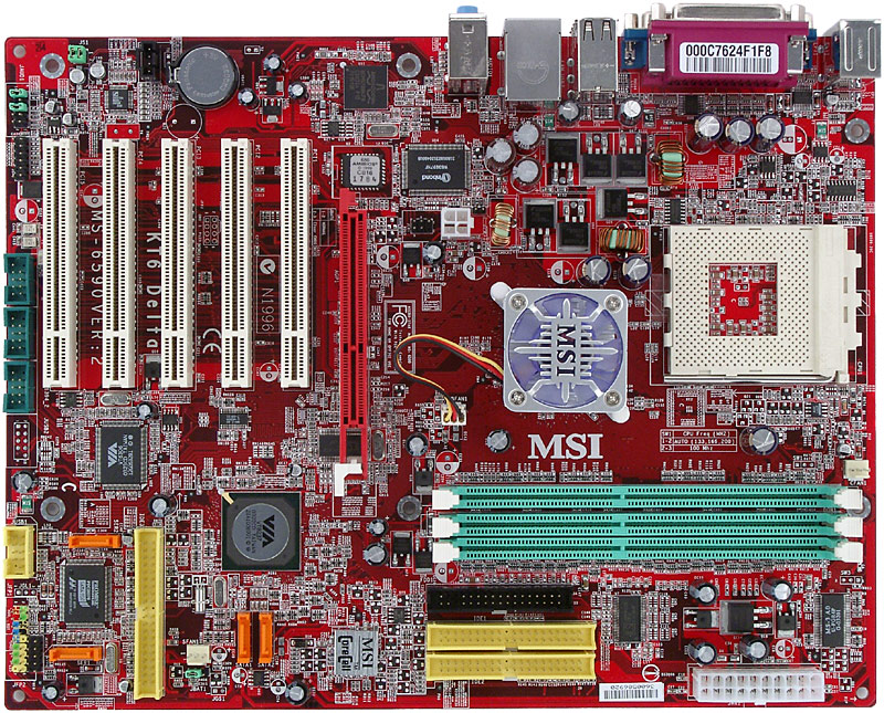 Разводка платы, вполне ожидаемо, не очень удобна: разъемы RAID расположены позади слотов PCI, а звуковые разъемы перед ними, также может затруднить сборку скученность разъемов вокруг модулей памяти. Доступ к единственной имеющейся перемычке может быть затруднен при установке платы в корпус, краткое описание ее функциональности приведено на текстолите. В трехканальном импульсном стабилизаторе напряжения питания процессора применены 5 конденсаторов по 2200 мкФ и 3 по 1500 мкФ. Также на плате находятся стабилизаторы напряжения шины AGP (включающий 2 конденсатора по 1000 мкФ) и памяти (1 на 1000 мкФ и несколько менее емких). Из разведенных, но не распаянных элементов на плате можно отметить разъем для подключения дополнительной планки USB. Размеры платы 305х245 мм (стандартный ATX, крепление к корпусу девятью винтами).