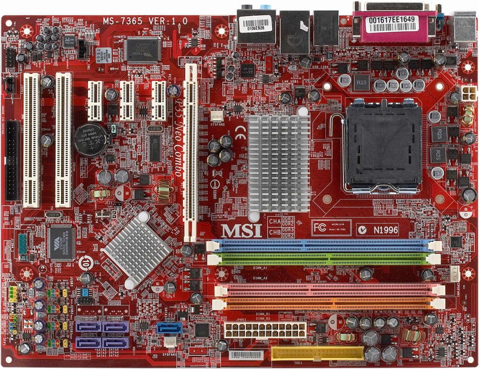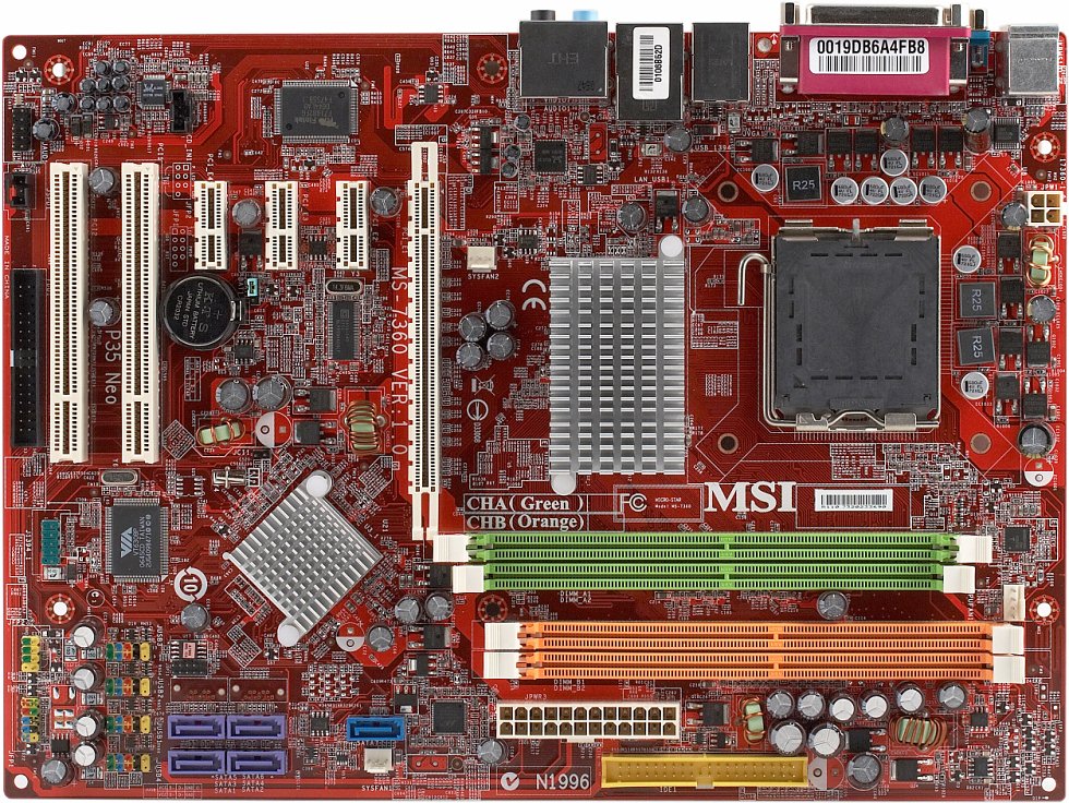 Разведены, но не распаяны на текстолите нашего экземпляра платы 2 разъема SATA (они используются в варианте платы с южным мостом ICH9R). Помимо двух рассматриваемых сегодня моделей MSI выпускает еще одну точно такую же на базе G33 (G33 Neo с поддержкой только DDR2), а также ряд плат на P35 и G33 в сериях Platinum и Diamond — эти основаны на другом дизайне PCB (в частности, предусматривающем два слота PCIEx16 для графики CrossFire) и используют сложную конструкцию с тепловыми трубками для охлаждения чипсета и полевых транзисторов. Любопытно, что на дизайне PCB моделей Platinum основывается и еще одна плата, P35 Neo2, которая просто лишена кулера на тепловых трубках — функциональность же всех моделей Neo исключительно схожа. Доступ к единственной имеющейся перемычке (очистки CMOS) немного затруднен вследствие ее близости к слотам расширения, описание ее функциональности присутствует на текстолите. Размер платы — 305×225 мм (чуть зауженный ATX), крепление к корпусу шестью винтами, ближний край платы провисает и доставляет некоторые неудобства при использовании расположенных на нем разъемов.