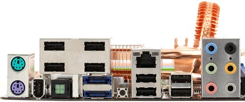 Здесь вновь применена конфигурация задней панели с выносом 4 портов USB на отдельное «табло», которая выглядит непривычно, но исключительно удобна в работе: крайне трудно подобрать два устройства, разъемы USB которых конфликтовали бы при подключении к плате, включая USB-флэшки самой экзотической формы. Кроме того, инженеры MSI реализовали очень удачную идею своих коллег из Shuttle: теперь выполнить сброс CMOS можно, не залезая в корпус, что, конечно, гораздо удобнее, чем даже нажимать кнопку на плате.