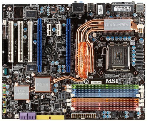 На плате применена необычная схема импульсного стабилизатора напряжения питания процессора: использованы два независимых 4-канальных ШИМ-контроллера (имеющие по 2 полевых транзистора на канал), что, по идее, должно давать некоторый выигрыш даже в сравнении с 8-канальным контроллером, применяемым на многих топовых платах. На всей плате (а не только в цепях питания процессора) используются исключительно полимерные конденсаторы (Low ESR, сделанные в Японии), причем в цепи питания процессора их довольно много (12 по 820 мкФ на 2,5 В и 3 по 470 мкФ на 16 В — все от Sanyo). Понятное дополнительное внимание уделено подсистеме питания памяти: в ней применено несколько индуктивных элементов и те же отборные конденсаторы от Sanyo. Кроме того, MSI использует дроссели с ферритовыми, а не железными сердечниками, что уменьшает их энергопотребление и, следовательно, нагрев. Кстати, и система охлаждения чипсета отлично делает свое дело, оставляя радиаторы на мостах чипсета едва теплыми. Размер платы — 305×245 мм (полноразмерный ATX), крепление осуществляется при помощи 9 стандартных винтов, все углы жестко зафиксированы.