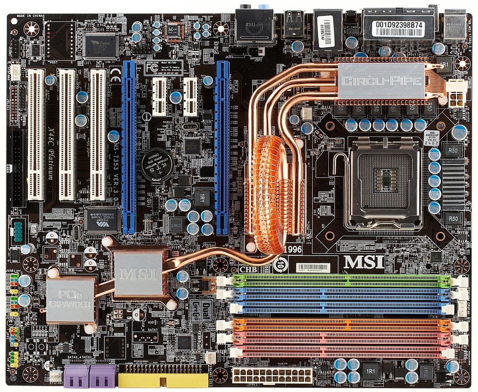 За исключением района модулей памяти, плата при первом взгляде на нее кажется вполне привычной: бросается в глаза система охлаждения чипсета на тепловых трубках, но похожую мы уже видели у P35 Platinum (кстати, нынешняя реализация Circu-Pipe — куда более скромная по размерам и количеству радиаторов, хотя чипсет стал даже чуть-чуть горячее из-за повышенной частоты FSB). Лишь при повторном взгляде глаз выявляет маленькое несоответствие: система охлаждения рассчитана как будто на 3 чипсетных моста (или иных горячих микросхемы). Ситуация действительно странная, так как никаких дополнительных элементов, требующих такого охлаждения, в спецификации платы не значится. Значатся они (в количестве одной штуки) у старшей сестры данной модели — MSI X48 Platinum, где загадочной третьей микросхемой является «расширитель PCI Express» (мост, разводящий периферийные линии PCI-E южного моста чипсета на два дополнительных слота PCIEx16 для организации графической подсистемы из 4 карт). Ничего удивительного не было бы и в этом факте: производители часто делают общую разводку у близких моделей плат — но дело в том, что по дизайну X48 Platinum существенно отличается от PCB X48C Platinum (в частности, старшая модель поддерживает только DDR3 и имеет 4 слота для памяти).