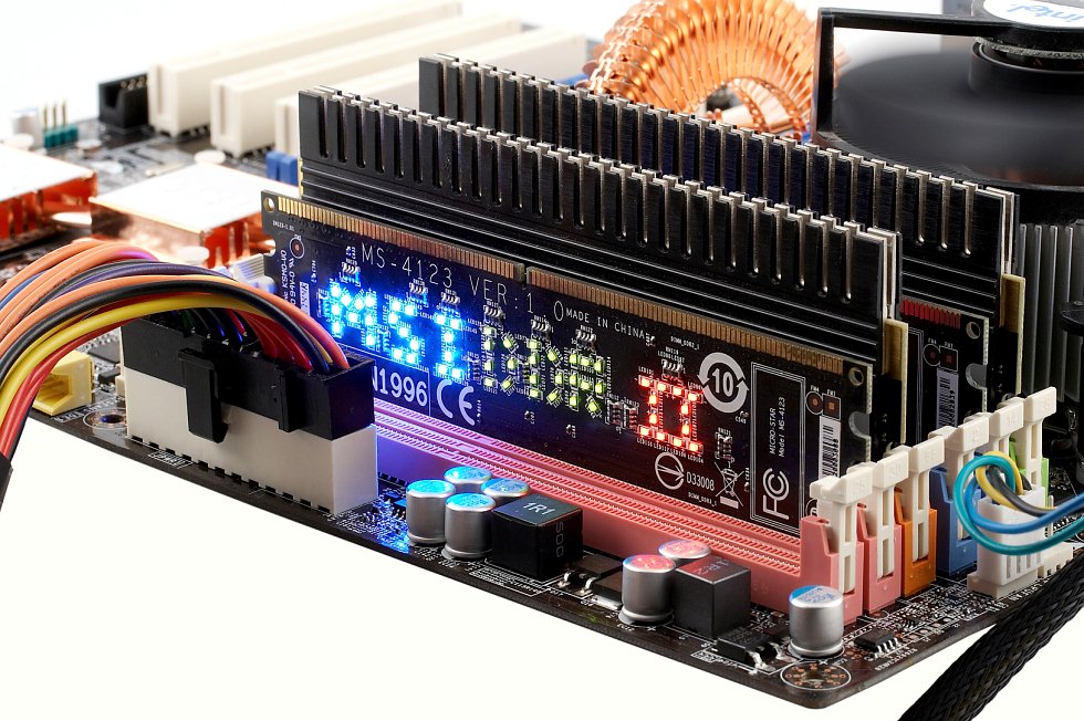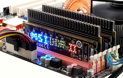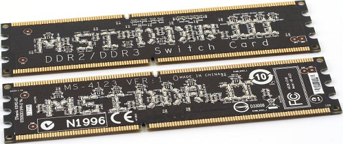 В данном случае, однако, MSI использовала более редкий вариант: на плате X48C Platinum распаяны не просто слоты для обоих типов памяти (картина относительно привычная для переходного периода, когда такую технологию поддерживает чипсет), а еще и схема переключения режима работы чипсетного контроллера памяти. К сожалению, очень уж изящным это решение назвать нельзя, так как пользователь вынужден установить в слоты для памяти две карты-заглушки (если используется память DDR2 — то в слоты для DDR3, и наоборот). Карты при необходимости переворачиваются вверх ногами для соответствия типу разъема. В качестве полезной компенсации за громоздкость решения, на этих заглушках смонтирована россыпь светодиодов, которые образуют название текущего работающего типа памяти и помогают диагностировать проблемы при загрузке самим фактом своего включения/невключения.