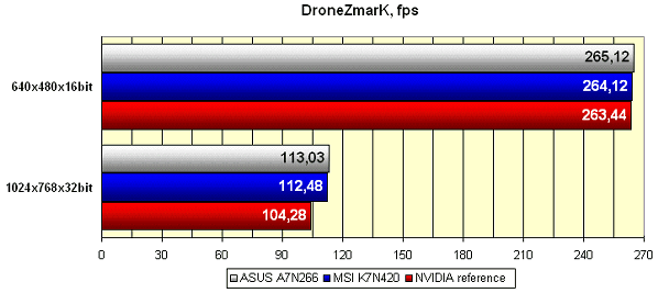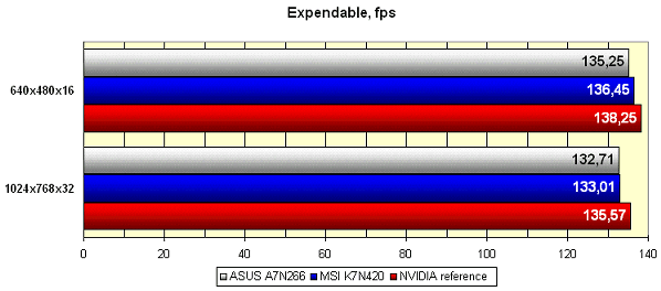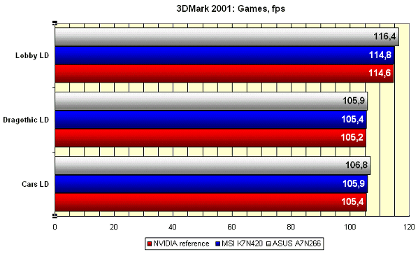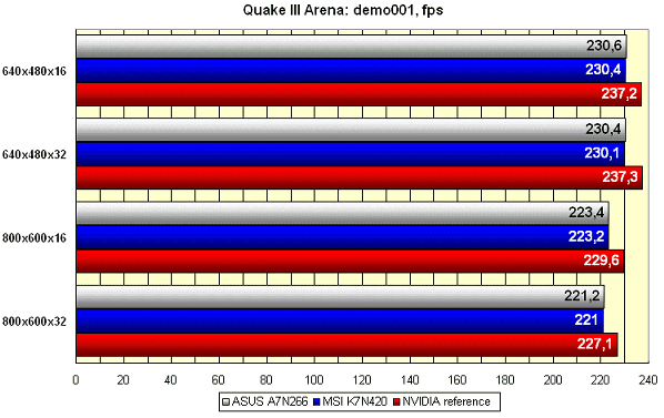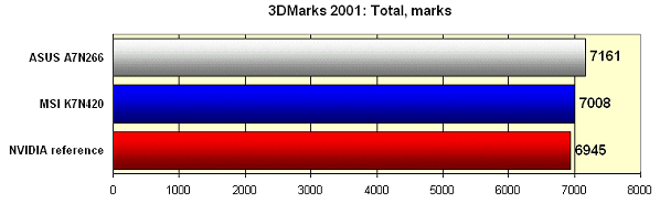 В любом случае, раздумья облегчены тем, что референс от NVIDIA вы в продаже не встретите :). Из двух же серийных плат выбор придется делать самостоятельно, но как раз между ними разница в тестах не настолько велика, чтобы стать определяющей. Нам по совокупности больше приглянулась плата ASUSTeK A7N266.