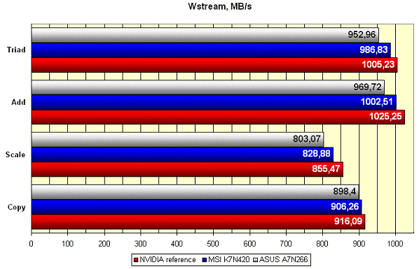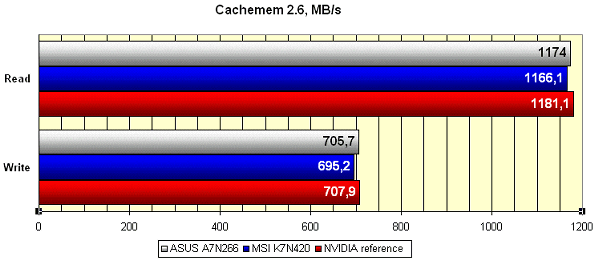 Вторая, и гораздо более интересная неожиданность: плата от MSI по-прежнему немного отстает от нового-старого лидера, а вот ASUS уверенно, на 56%, позади. Обратите внимание: в почти чистом тесте на скорость памяти Cachemem (тут никакой DASP не поможет оптимизировать обращения) ASUS идет почти наравне с референсом, а в Wstream, где, как вы могли видеть в нашей прошлой статье, возможности DASP раскрываются по полной, проигрывает очень много. Не слишком ли смелым будет предположение, что инженеры и биосописатели ASUS постарались оптимизировать работу с памятью таким образом, чтобы свести на нет вредные последствия конкурентной работы блоков предвыборки Athlon XP (Palomino) и nForce IGP? Может быть, в итоге DASP оказался попросту отключен? Заметим, впрочем, что это предположение основано исключительно на результатах тестов и не подтверждается NVIDIA. Давайте смотреть дальше.