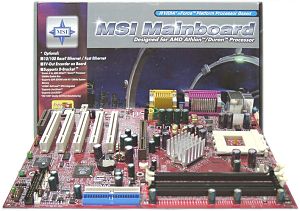 В стандартно пестрой коробке находилась сама плата (предсерийный образец), выполненная на любимом MSI текстолите красного цвета, руководство пользователя на английском языке, кабель ATA66/100 и шлейф для подключения дисковода. Также в коробке оказались две планки с двумя портами USB на каждой, два D-Bracket (серийные материнские платы будут комплектоваться одной планкой каждого из этих двух типов), карта расширения, вставляемая в слот AGP и реализующая вывод сигнала на телевизор, планка с выходом SPDIF и компакт-диск.