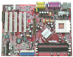 Плата выполнена на хорошем уровне, да иного и не следовало ожидать от этой компании. Разводка удачна, но впрочем, есть и несколько минусов: не самое приятное место разъема для подключения дисковода и традиционное для почти всех изделий расположение аудиовходов перед слотами PCI. Это, однако, частично компенсируется размером платы  всего 22,5 сантиметра в ширину. На слоте AGP, к сожалению, нет защелки, к которой мы уже стали привыкать. В качестве сетевого контроллера используется интегрированный в южный мост чипсета  здесь нет, как на плате от ASUS, внешней микросхемы, нет и карты расширения  разъем RJ45 распаян в ряду выходов на заднюю панель. В цепях питания ядра процессора применен многоканальный источник напряжения, что должно положительно сказаться на стабильности работы платы в ненормативных условиях. Функции нескольких переключателей достаточно стандартны: очистка содержимого CMOS, запрещение/разрешение записи в микросхему EEPROM, выбор используемого динамика  встроенного или внешнего, включение/выключение возможности запуска системы с клавиатуры или мышки, а также выбор базовой частоты процессора  Safe или User.