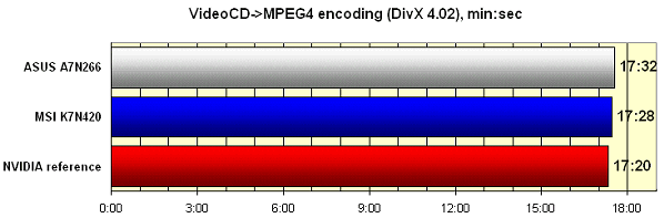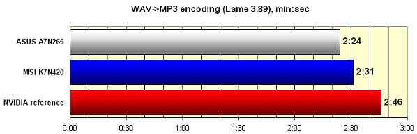 Помните жуткие результаты этого кодирования при тестировании референсной платы? Нынешние показатели MSI и особенно ASUS значительно улучшают картину, и при заочном сравнении с платами на чипсете VIA выводят nForce вперед. В конце концов, пусть результаты будут даже ниже, но предсказуемее. :)