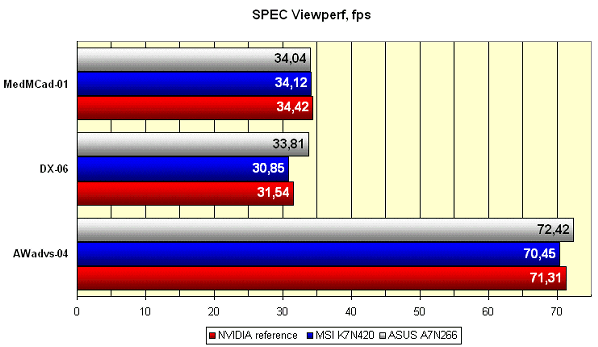 Сразу отметим, что результаты не отображенных на диаграмме тестов SPEC Viewperf совпадают (в процентном соотношении) с результатами MedMCad-01, а в ProCDRS платы вообще финишировали сотая в сотую. Тесты этого профессионального набора OpenGL-приложений не особо выигрывают от применения DASP, а наиболее вероятным объяснением отрыва платы ASUS является ее улучшенная работа с AGP, так как тесты AWadvs-04 и DX-06 чувствительны именно к скорости прокачки и наложения текстур.