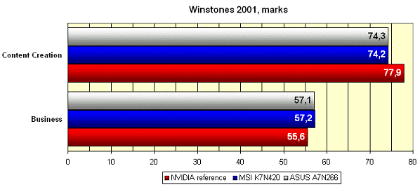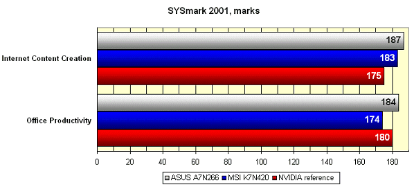 Если в «однозадачном» Content Creation Winstone 2001 референс впереди, то несколько одновременно работающих приложений SYSmark 2001 отследить и «обслужить» предвыборкой данных из памяти гораздо сложнее, и тут уже ASUS и MSI снова лидируют.