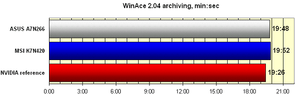 При архивировании WinAce (опять же вспомним сравнение в предыдущей статье с VIA KT266A) идет плотная работа с памятью, и DASP получает хорошую возможность продемонстрировать свою полезность. Он ее и демонстрирует  на референсной плате. А вот обе соперницы почти синхронно отстали  о чем нам это говорит?