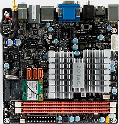 Также можем сказать только добрые слова в адрес конкретной реализации платформы — системной платы Zotac ION-ITX-A. Аккуратная плата с богатым набором периферийных интерфейсов, разумной системой охлаждения и внешним БП — это ли не мечта?! Плюс грамотный набор вариантов поставки, включая пару моделей, рассчитанных не на внешний, а на внутренний БП в корпусе mini-ITX. К сожалению, мы не можем однозначно утверждать, что системе удастся обеспечить пассивное охлаждение в каком угодно корпусе, но в любом случае решения Zotac позволяют создать очень компактный и тихий компьютер с богатым внутренним содержимым. Плата Zotac ION-ITX-A неизбежно получает награду нашего сайта за оригинальный дизайн.