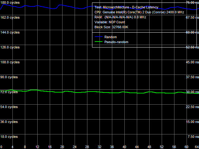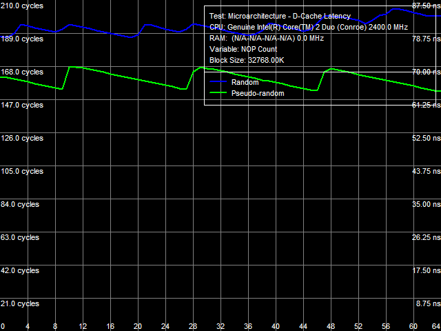 А вот исследуя латентность памяти, мы получаем крайне любопытную и показательную картину: взгляните на фантастические результаты nForce 680i SLI при псевдослучайном чтении! Тут самое время помянуть появление на рынке первых чипсетов NVIDIA и их революционного блока DASP для аппаратной предвыборки и кэширования данных в чипсете. Знакомым с алгоритмом тестирования RMMA будет любопытно взглянуть на визуальные различия графиков латентности чтения из памяти: у Intel P965 присутствует обычная «пила», величина «зубьев» которой определяется КУ процессора (что влияет на взаимное расположение команд чтения из потока команд теста), а вот у nForce 680i SLI это практически прямая линия — как такового, обращения к памяти не происходит. Показательна и отсутствующая разница между 1T и 2T command rate — в то время как при случайном чтении последний режим получает серьезный штраф, уступая первому около 8%. Выводы напрашиваются недвусмысленные: DASP 4.0 замечательно кэширует открытую страницу памяти, позволяя очень быстро получать доступ к ее данным, что, в условиях предпочтительного чтения из одной страницы при псевдослучайном доступе, и приводит к столь блестящим результатам.
