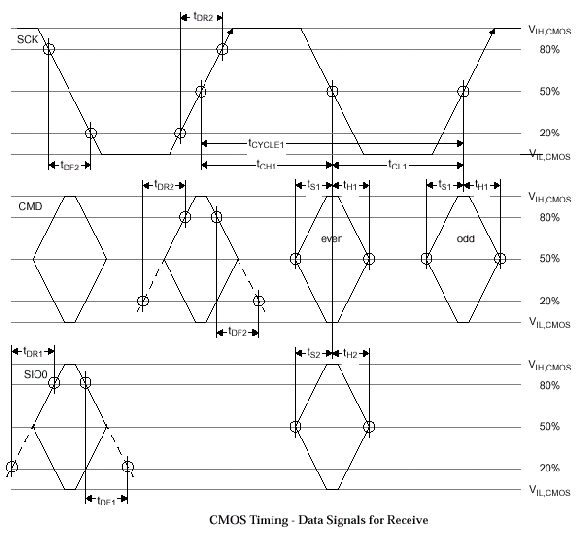 За счет внешнего опорного напряжения (VREF=1.4 В) стандартного CMOS-интерфейса, генерирующегося при помощи резистивного делителя, логические значения "0" и "1" представляются как 2.5 В (VOH,CMOS) и 1.7 В (VOL,CMOS) соответственно, т.е. разрядность составляет все те же 800 мВ, чтобы сохранить совместимость дискретизации уровней.