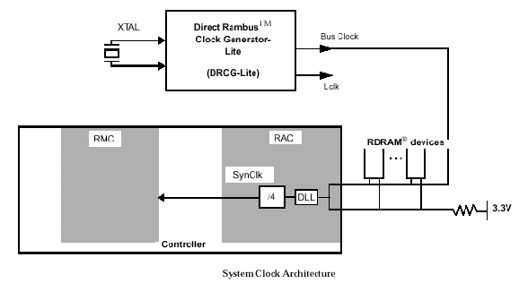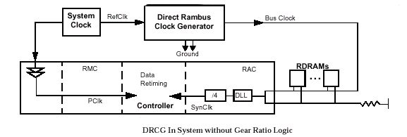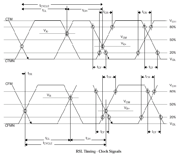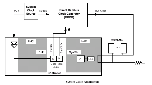 Тактовый генератор вырабатывает импульсы с частотой 267-400 MГц, которые распространяются от крайней точки канала к контроллеру (CTM Clock To Master), где разворачиваются и по другой линии идут в обратном направлении (CFM Clock From Master), после чего попадают на терминатор (нагрузку, VTERM=1.8 В). Четкое согласование становиться возможным благодаря двум блокам автоподстройки длительности задержки в библиотечном макроядре (RAC Rambus ASIC Cell), которые производят синхронизацию исходящих и входящих сигналов: блок передачи (TDLL Transmit Delay Locked Loop) и блок приема (RDLL Receive Delay Locked Loop). Передача команд и данных (блок TDLL) основана на эффекте точной 180° квадратурной фазы, выполняемой в цикле CFM. Все сигналы, распространяющиеся по направлению к контроллеру, синхронизируются входящими тактовыми импульсами, а сигналы, исходящие из контроллера импульсами, идущими по направлению к нагрузке (функции блока RDLL). В процессе работы каждый блок DLL периодически осуществляет частотную ре-калибровку, учитывая условия функционирования, температуру (документ JESD63), возможные девиации напряжения и частоты. Ре-синхронизация (Re-Sync) всех узлов подсистемы, включая физические интерфейсы типа сдвига уровня напряжения и восстановления синхросигналов, представляется отдельным особенным комплексом мер, поскольку с увеличением частоты, длина волны сигнала становиться более короткой относительно собственной сигнальной трассы. В этом случае полагаться на пассивные элементы задержки (например, RC-цепь), помогающие восстановить "плывущий" протокол синхронизации, довольно опасно, учитывая влияние температуры, напряжения и 3s-вариаций (зависимость сечения рассеяния электромагнитной волны от ее частоты).