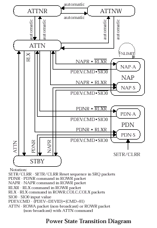 Каждый из блоков приема/передачи (мультиплексоры и демультиплексоры) должен постоянно "плавать" между состояниями STBY и ATTN, используя необходимый управляющий сигнал StopХХХ такого рода перемещения между этими двумя состояниями активности являются независимыми или зависимыми, и определяются сигналами StopT и StopR по утвержденному (уровень сигнала, достаточный для однозначного фиксирования перехода приемником, активный уровень) состоянию PwrUp и деактивированному Nap. Когда Nap/PwrUp не утвержден/утвержден, состояние NAP/PDN является выходным, а ATTN или STBY входящими в зависимости от значения сигналов управления StopT и StopR. Так, например, когда вход PwrUp деактивирован, основные функционирующие блоки входят в состояние PDN из которого могут немедленно выйти. Тоже самое происходит, когда состояние Nap является утвержденным, из которого блоки могут выйти лишь через время t31 (интервал действия NAP: 0.005-10 ms). Во время активности сигналов StopT и StopR действительный Nap позволяет минимизировать потребляемую мощность в состоянии «дремоты». Случай одновременной активации Nap и деактивации PwrUp является предшествующим состоянию PDN, которое утвердится в следующий момент.