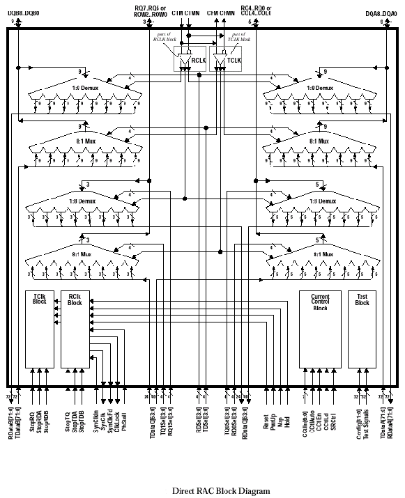 Понятно, что контроллеры подсистем Concurrent и Direct различаются внутренней схемотехникой, внешним интерфейсом и способом построения. Поэтому в контексте составляющих подсистем Rambus здесь и далее имеется ввиду именно Direct Rambus для CRDRAM, где это необходимо, будет делаться соответствующее пояснение. Интерфейс ядра также характеризует функционирование RAC как высокопроизводительного параллельно-последовательного и последовательно-параллельного преобразователя, выполняющего упаковку/распаковку функций RDRAM на высокой частоте в широкие 64bit пакеты адреса на прием (RDataQ[63:0]) и передачу (TDataQ[63:0]), и аналогичные 144bit синхронные данные на прием (RDataA[71:0], RDataB[71:0]) и передачу (TDataA[71:0], TDataB[71:0]) отдельно. Тестовый интерфейс и интерфейс отладки ядра RAC предусматривает 20 сигнальных групп.