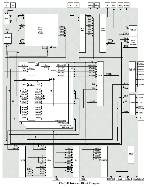 RMC.d1 состоит из блока генерации адреса, маски и слоя (Field, Mask & Merge), соединенного с блоками генерации карты (Map) и региона (Region U/V); блоков чтения и записи данных (Read/Write Data); блока динамического изменения частоты синхронизации с основной подсистемой (PClkEn), выполняющего функции адаптации коэффициента умножения частоты для вариации коммутаций PClk и SynClk, позволяющих максимально увеличить отдачу блока приложений; машины состояния (BfPt), блоков задержки/накопления (Stall), управления (Control), регенерации и тококонтроля (Refresh & CC), останова (Stop), обработки и выдачи данных (DQA/B), генерации адреса стоки (Row) и столбца (Col), и блока слежения за общим состоянием (Ref/Rlx). Основу RMC.d1 составляют четыре буфера транзакций (Z) с основными состояниями {E, F, G, H}, каждый из которых содержит машину состояний (State Machine), логику выбора подходящего адреса (Match) для проверки конфликтов банка и устройства, и буферный регистр (BufReg). Сигнальный интерфейс контроллера содержит 15 линий ввода/вывода, 11 синхросигналов и 57 сигналов общего назначения (смешанная группа).