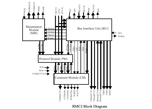 Внутренние транзакции RMC.d2 выполняются несколько иначе. Логические пакеты следуют через модуль протоколов (PM Protocol Module), который принимает запросы на транзакции от блока интерфейса шины (BIU Bus Interface Unit). Запросы всех строчных (Row) и столбцовых (Column) пакетов необходимо выполнять в цикле запрошенных транзакций, в правильном логическом порядке. Тайминговые пакеты и операции возврата следуют через модуль уплотнения (CM Constraint Module), который принимает пакеты запроса от модуля протокола и выдает уже "форматированные" пакеты непосредственно в RAC, но только тогда, когда все текущие операции исполнены. В пределах PM они разделяют блок протокола обслуживания (SPU Service Protocol Unit) для каждой незавершенной транзакции, а в пределах CM таймер уплотнения (CT Constraint Timer) для каждого пакета, задержанная временная диаграмма которого еще не полностью обработана.