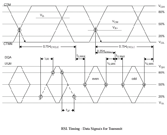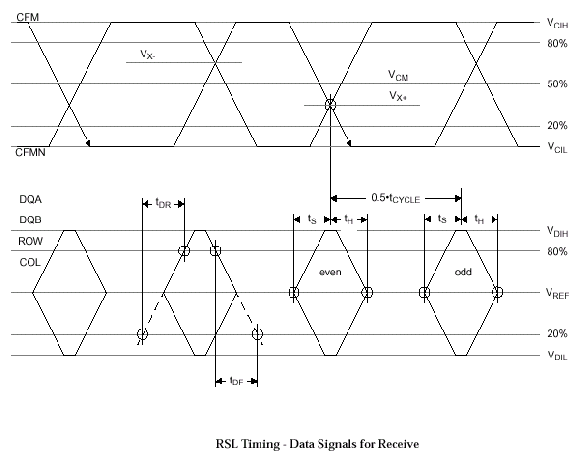 Сигнальный протокол Direct Rambus основан на новом электрическом интерфейсе RSL (Rambus Signaling Levels), дающем возможность при помощи технологии удвоенной передачи данных (DDR Double Data Rate) получить результирующую частоту 600/711/800 MГц и использовать стандартный CMOS-интерфейс (см. схему 1 и схему 2) сигналов управленияядра ASIC (Application Specific Integrated Circuit). Высокоскоростной протокол сигналов RSL использует низковольтный размах (Swing) номинальных напряжений логического "0" (VOH=1.8 В) и логической "1" (VOL=1.0 В) с разностью 0.8 В (VCOS=VOH-VOL).