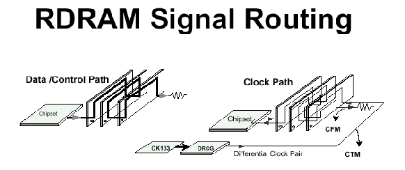 Технология Direct Rambus DRAM, разработанная компанией Rambus, представляет собой высокоскоростную замкнутую систему функционирования, которая имеет свою адаптированную логику управления и точно рассчитанные параметры. DRDRAM позволяет достичь очень больших пиковых скоростей передачи данных: до 1.6 Гбайт/с на один канал и до 6.4 Гбайт/с при четырех каналах. Вся подсистема состоит из следующих компонентов: основной контроллер (RMC Rambus Memory Controller), канал (RC Rambus Channel), разъем для модулей (RRC - Rambus RIMM Connector), модуль памяти (RIMM Rambus In-line Memory Module), генератор дифференциальных синхроимпульсов (DRCG Direct Rambus Clock Generator) и сами микросхемы памяти (RDRAM Rambus DRAM). Физические, электрические и логические принципы и согласования, применяемые в системе, определены компанией Rambus и должны строго выполняться всеми производителями для соблюдения абсолютной совместимости ее частей, так она функционирует на очень большой частоте 600/711/800 МГц, синхронизируясь сигналом 300/350/400 MГц соответственно.