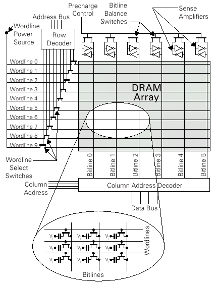 В современных микросхемах ДОЗУ матрица ячеек (основа ячейки  транзистор и конденсатор), составляющая ядро микросхемы, делится на несколько суб-матриц, называемых логическими (внутренними или архитектурными) банками (Bank). Такая иерархия преследуют две цели: позволяет производить операции фрагментации над резервируемыми (Redundant) с целью устранения возможных дефектов, возникающих при производстве (RMD  Repaired of Manufacturing Defects), составляющими ядра массива  строки (Word Lines), столбцы (Bit Lines или Data Lines) или отдельные ячейки (Individual Cells),  а также повышать производительность устройства одновременным выполнением совместных операций (Concurrent Operation) и разделением циклов регенерации (конвейеризация), делая их «прозрачными» относительно системы. Банки ядра соединяются внутренней шиной кристалла со специальными электрическими схемами-накопителями, именуемыми усилителями уровня (Sense Amplifier или SenseAmp), которые сохраняют данные одной строки логического банка на период проведения регенерации ее содержимого. Так, усилители уровня занимают намного большую площадь, чем сами ячейки памяти, и располагаются в непосредственной близости от столбцов ассоциируемых с усилителем логических банков, соединяясь с ними внутренней шиной данных.