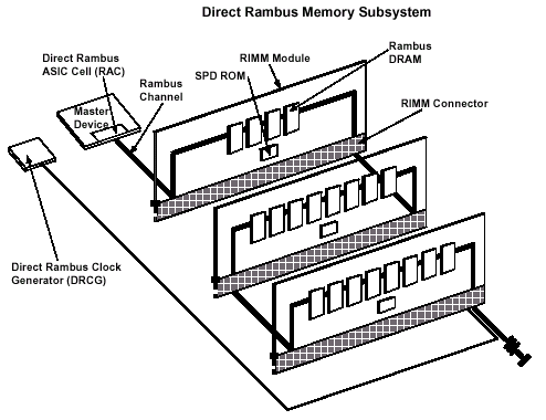 Типичная подсистема Direct Rambus с длинным каналом состоит из контроллера (RMC  Rambus Memory Controller), до трех разъемов (RIMM Connector) под модули памяти (RIMM  Rambus In-line Memory Module), формирователя синхросигналов (DRCG  Direct Rambus Clock Generator), источника питания и дискретных компонентов, осуществляющих терминацию (оконечную согласующую нагрузку). Каждый разъем может заполняться либо модулем памяти, либо продолжителем канала (D-RIMM-CONT), однако система должна иметь как минимум один RIMM на канал. В свою очередь, один модуль памяти может содержать от 1 (реально  от 4) до 16 микросхем памяти при общей полной нагрузке в 32 устройства на канал.