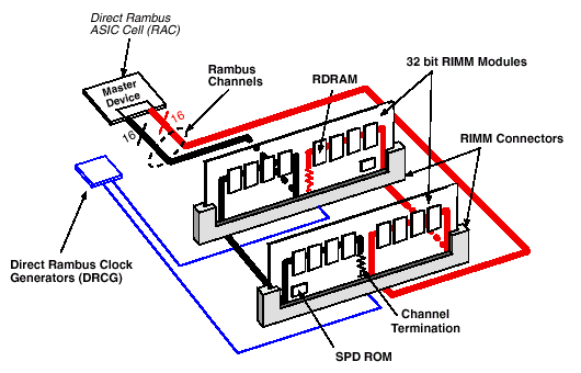 В 1999 году корпорация Rambus анонсировала новую технологию динамической памяти  Direct Rambus DRAM (DRDRAM),  позволяющей восьмикратно повысить пиковую пропускную способность относительно повсеместно доминирующего в то время PC100 SDRAM при условии равной ширины шины данных этих двух интерфейсов. Тем не менее, первым шагом молодой технологии был всего лишь модуль RIMM с 16bit шиной данных. Как и предыдущие технологии динамической памяти, Rambus DRAM также двигается параллельными путями, постепенно увеличивая пропускную способность расширением внешнего интерфейса, однако при этом не вводя кардинальных изменений в сами устройства динамической памяти (микросхема DRDRAM) и интерфейс коммуникаций с контроллером. Поскольку в основе данной технологии лежит концепция канальной иерархии, интерфейс можно расширять просто объединяя между собой несколько каналов  в результате делается возможным создание 32bit и даже 64bit модулей RIMM.