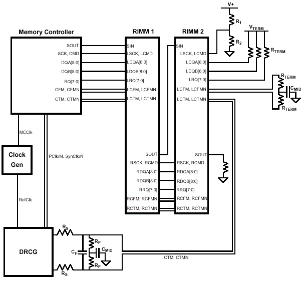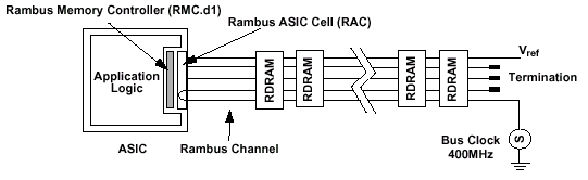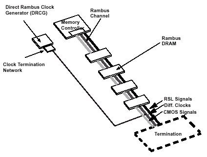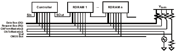 Рассматриваемая высокоскоростная RSL-структура состоит из сигнальных линий, начинающихся от контроллера, проходящих через все микросхемы памяти, и заканчивающихся на серии терминаторов. Нагрузочные сопротивления, в свою очередь, служат для согласования полного сопротивления шины, к которой подключены устройства  иными словами, сопротивление нагрузки должно быть равно сумме сопротивления источника и сигнальной линии. В результате, согласование достигается благодаря резистору, смещающему логический уровень на величину VTERM.