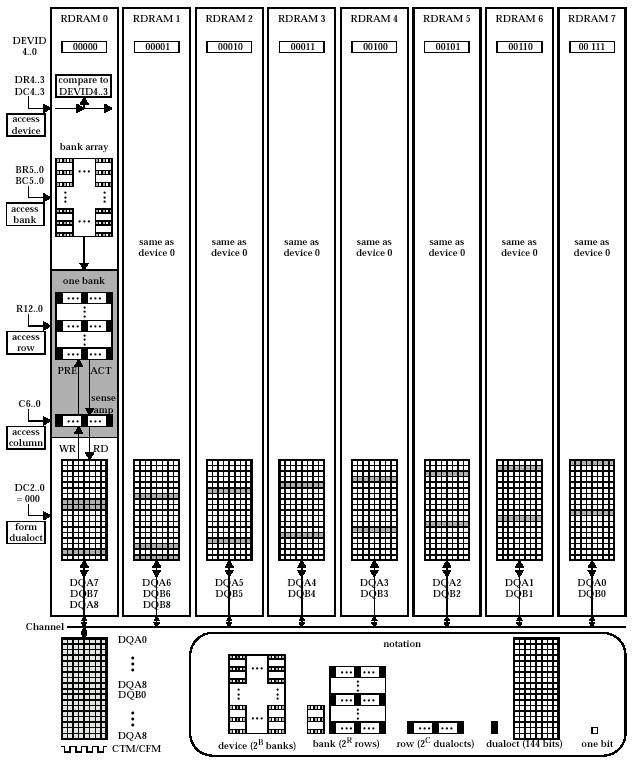 Как и любые другие микросхемы памяти, рассматриваемые устройства состоят из двух основных блоков: ядра (Core), включающего в себя логические банки (Bank) c усилителями уровня (SenseAmp), и Direct Rambus-совместимой интерфейсной части, являющейся коммуникационным механизмом для связи с контроллером памяти. Забегая вперед необходимо отметить, что различие в рассматриваемых архитектурах микросхем DRDRAM состоят исключительно во внутренней логической части. Стандартно, массив микросхемы содержит банки (Bank), количество и организация которых определяется фундаментальностью самой архитектуры и конечной емкостью устройства. Банки содержат строки (Row), которые, в свою очередь, содержат столбцы (Column)  матрица, образующаяся такой иерархией, и является ядром микросхемы памяти. Строка  это объем считываемых или записываемых данных в один из нескольких банков ядра. Столбцы  подмножества строк, которые считываются или записываются в индивидуальных фазах операций чтения/записи.
