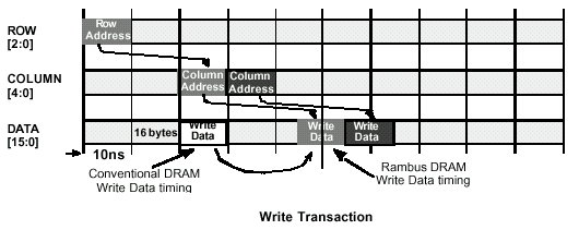 Тайминги транзакции чтения и записи очень похожи, поскольку пакеты управления посылаются практически одинаково. Тем не менее, одна значительная разница между RDRAM и обычным DRAM заключается в задержке записываемых данных для выравнивания относительно таймингов передачи данных транзакции чтения. Данная задержка выбирается такой, чтобы максимально использовать полосу пропускания шины данных. В обычной SDRAM, когда команда чтения следует за командой записи, на шине данных возникает промежуток (Gap) между этими двумя операциями, который по длительности эквивалентен задержке чтения из устройства. Если, к примеру, 100MHz микросхема SDRAM имеет задержку чтения 3T (три такта системной шины), то необходим 30ns интервал между окончанием фазы записи и началом цикла чтения. RDRAM свободна от данного интервала, поскольку просто посылает данные позднее, после чего фактически выполняется последовательность записи. Команда записи по COL-шине указывает микросхеме какие именно данные будут записаны в устройство позднее, через четко определенный интервал  обычно эти данные записываются в массив так скоро, как будут приняты. Используя как опцию для задержки записи этих данных, можно разрешать команде чтения опережать (так называемый цикл «Go Around») запись, уменьшая эффективную задержку чтения, которая обычно довольно критична. Тем не менее, основная масса записываемых данных обычно буферизируется и не является чувствительной к задержке. Если алгоритм контроллера выбрал этот режим, то проверки одного единственного адреса будет более чем достаточно, чтобы точно определить соответствие команды чтения не полностью записанным данным. В этом случае чтение может быть задержано определенно установленный временной интервал, или данные просто могут быть возвращены в пределах внутренних схем контроллера инициатору запроса, экономя полосу пропускания канала на выполнении такой тривиальной транзакции.