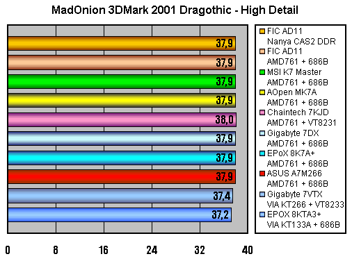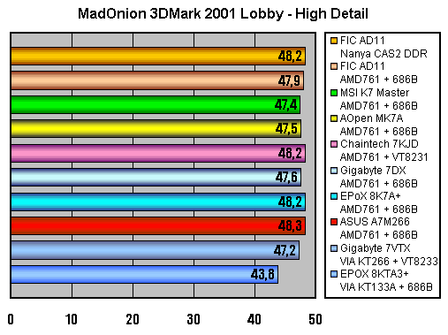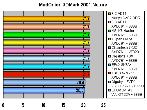 Хорошее подтверждение для всех предыдущих наших выводов. Nature — тест с очень сложной сценой и громадным количеством высоко детализованных объектов, и в нем AMD-760 чувствует себя просто превосходно, в отличие от обоих чипсетов VIA.