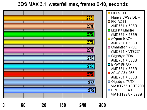Ровная линеечка результатов наводит на мысль, что тестирование в 3DStudio MAX скорее показывает нам скорость процессора, чем подсистемы памяти. Даже VIA KT133A в процентном соотношении не сильно отстал от самой быстрой платы на AMD-760 — всего на ~2%, что по самым строгим меркам не является заметным превосходством, и практически не может быть замечено на уровне пользователя, без помощи специальных тестов и замеров.