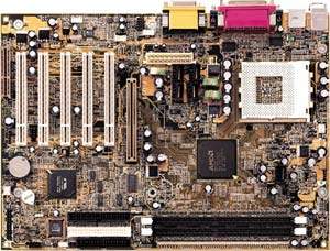 Во-первых, это меньшее количество слотов PCI — их здесь всего три, нет каких-либо дополнительных "вкусностей" — таких как дополнительный контроллер IDE и т.д. Но плата от этого не становится хуже — просто она ориентирована на другой сегмент рынка, и место ее на столе сборщика, а не в руках опытного пользователя, решившего самому собрать компьютер. Естественно, что такая плата не будет выделяться из общего ряда, и наносить золотое напыление и покрывать плату лаком необычного цвета производитель не будет, ведь таких плат на прилавки попадет немного — в основном они будут встречены с радостью производителями компьютеров. Соответственно нет смысла давать пользователям подобных плат и больших возможностей по конфигурации системы и т.д. Минимализм в чистом виде, так сказать.