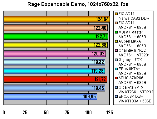 Выигрыш AMD-760 у KT133A очевиден и в комментариях не нуждается, а вот с KT266 все немного сложнее — все-таки плата на его основе у нас участвует всего одна, а разброс результатов не столь велик, и в принципе его можно было бы списать на возможную погрешность измерений. Однако в целом мы бы сказали что AMD-760 в этих тестах все же выиграл, особенно в Expendable. Правда, с минимальным отрывом.