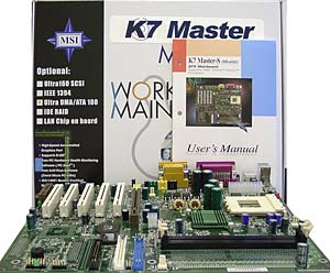 Плата от MSI поставляется в огромной коробке, и судя по тому, что на ней изображено, внутри лежит ни что иное, как "MSI Workstation Mainboard". Помимо нее, в комплект вошли два шлейфа FDD и 80-жильный IDE, компакт-диск с драйверами и фирменными утилитами, руководство пользователя на английском языке и пакетик с двумя наклейками — "Geared by MSI" (лицевая, на корпус) и с расшифровкой состояний индикатора D-Led. Из содержимого диска заслуживает внимание программка Live BIOS, позволяющая обновить BIOS без загрузки "чистого" DOS (такая возможность стала довольно актуальной после широкого распространения операционных систем, не поддерживающих DOS-режим, например, Windows ME). Компания MSI конечно является не единственной, кто предлагает подобный сервис, но в любом случае это плюс. Поскольку K7 Master относится к разряду Workstation, такая чисто домашняя примочка как соединение двух PC посредством USB, для платы не предусмотрена, соответственно, дополнительные USB планки и кабель в комплект не входят.