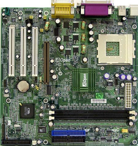 Эта компания уже достаточно хорошо известна на российском рынке, и материнские платы с этой надписью уже никого не удивляют своим видом на витринах компьютерных супермаркетов — именно эта компания первой среди равных стала уделять внимание не только качественным и скоростным характеристикам материнских плат, но и их внешнему виду. Тем самым AOpen первой стала прокладывать новую дорогу к сердцам пользователей компьютеров, привлекая внимание не только весьма достойным содержанием, но и немаловажным эстетическим моментом. А вкупе с агрессивной рекламной политикой фирмы в России можно смело сказать, что в скором времени ни один пользователь PC у нас не задумается над тем, что же значит эта надпись на коробке — "AOpen". В нашем обзоре участвует один из представителей семейства материнских плат этой компании — плата MK7A. Она одна из всех плат, участвующих в нашем сравнительном тестировании, представляет форм-фактор MicroATX, что, естественно, накладывает свой отпечаток на то, что же можно увидеть на этой плате.