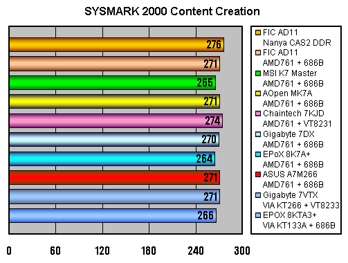 К большому сожалению, существующие системные платы на чипсете КТ266 не допускают корректной работы с CAS2 DDR модулями NANYA, а также пока невозможно добиться стабильной работы системы при Command Rate = 1T. Поэтому приведенные данные по чипсету KT266 полностью соответствуют данным, приведенным в нашем обзоре. Надеемся, что в ближайшее время ситуация изменится в лучшую сторону, а пока не будем забывать, что КТ266, в сравнении с чипсетом AMD760, еще имеет определенный запас производительности, который позволит окончательно уравнять их шансы.