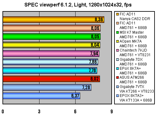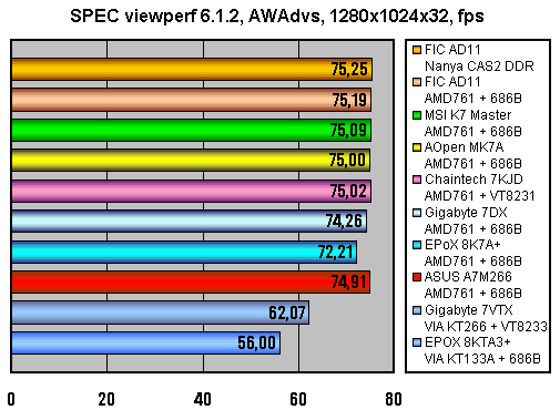 Воистину "потрясающие" результаты. В тестовом пакете SPEC viewperf 6.1.2 выигрыш AMD-760 не только виден невооруженным взглядом — он буквально бьет в глаза, иногда доходя до значения в 20% (тест AWadvs-04 на основе ядра пакета Advanced Visualizer от Alias/Wavefront). Мы как раз и остановимся на двух диаграммах из шести: с результатами вышеупомянутого AWadvs-04 и Light-04 (Lightscape Viewset). Выбраны они были по простому критерию: в AWadvs-04 самая быстрая плата на базе чипсета AMD-760 выиграла у VIA Apollo KT266 (в лице Gigabyte 7VTX) в процентном соотношении больше всего (~20%), а в тесте Light-04 — тоже выиграла, но меньше всего (~14%). Поскольку вряд ли это является случайным, проще будет сосредоточиться на специфике каждого из тестов, чтобы понять, почему выигрыш распределился именно таким образом.