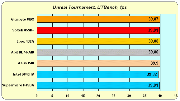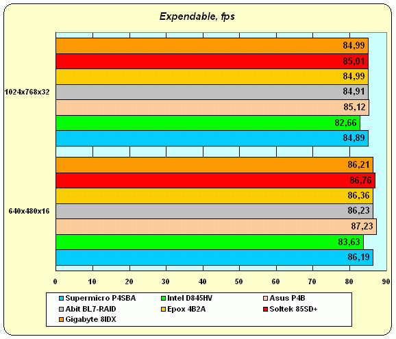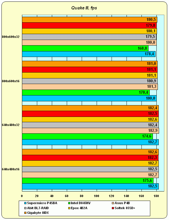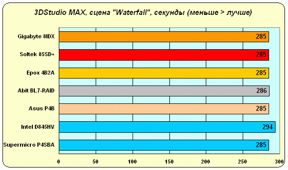 Впрочем, как и всегда, выбилась из общего знаменателя плата от Intel (наверное, это традиция такая, да — делать более медленные платы? :), и кое-где на мизерный процент показывают более высокую производительность изделия ASUS и Soltek (последняя все чаще и чаще стремится отобрать у ASUS титул "друга всех оверклокеров").
