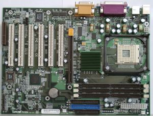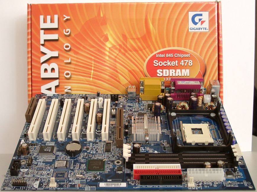 Плата представляет собой продукт формата MicroATX, и если в связке i850 + RDRAM этот формат казался забавным либо нелепым — в корпусе такого формата было достаточно жарко, да и цена на такое сочетание была дороговата для компьютера рынка SOHO, то пришедшая вслед за ним связка i845 + SDR SDRAM вкупе со снижением цен на процессоры линейки Pentium 4 уже вполне может занять свое место в высокопроизводительном компьютере для дома или офиса. Плата несет на себе три слота PCI и имеет не распаянное место под слот CNR — привычное количество слотов расширения для плат этого формата. Плата выполнена очень аккуратно — впрочем в качестве изготовления сомневаться и не приходиться. В последнее время производители почти поголовно перешли на оснащение плат за щелкой на слот AGP, или иначе — AGP Retention Mechanism. Вещь эта удобна, она не позволит вставить видеокарту не правильно или выпасть ей из слота при разного рода случайностях. Не совсем понятен вынос разъема второго последовательного порта на плату. Дело в том, что традиционно он расположен на задней части платы, и его перенос обусловлен либо наличием встроенного видеоадаптера, либо наличием на плате какого-либо контроллера, например Firewire. Но в данном случае на плате нет ни того, ни другого — на плате нет даже не распаянных мест под их установку. Да и следов, указывающих на возможную установку какого-либо разъема на это место — нет. Странно, что и говорить. Впрочем, по большому счету — это мелочь. А говорить о не совсем удобной разводке платы и говорить не стоит — сделаем скидку на ее формат. На плате почти нет переключателей — точнее он всего один. И назначение традиционно — можно прошить BIOS в режиме Recovery и зайти в дополнительное меню BIOS, где можно стереть пароли и изменить коэффициент умножения процессора — второе из этого, пожалуй, и является единственной возможностью разогнать процессор (благо у нас он был инженерным образцом с не заблокированным коэффициентом). Впрочем, если присмотреться внимательнее, то на плате можно увидеть не распаянные переключатели для изменения напряжения на ядре процессора и для изменения частоты — но экспериментировать мы не стали.