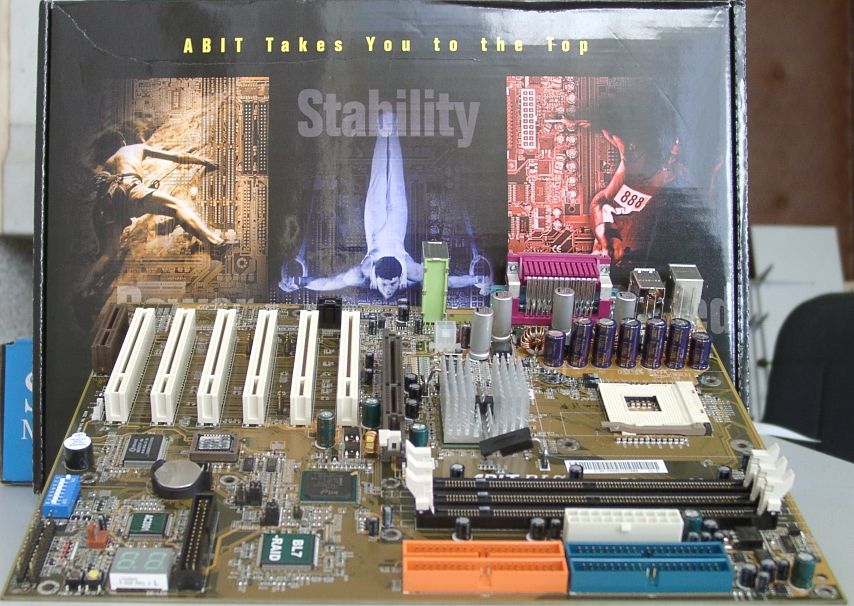 И так, к нам в лабораторию попал предсерийный экземпляр — но не смотря на это он был укомплектован под стать плате, уже вышедшей в серийное производство. В коробке темных тонов — стандартный дизайн последнего времени от Abit — находилось руководство пользователя, шлейф ATA66/100, кабель для подключения дисковода, планка на заднюю панель компьютера с разъемом Gameport'a, заглушка на заднюю панель компьютера, дискета с драйверами для IDE Raid — в некоторых случаях без нее не обойтись и компакт-диск с драйверами к плате. К сожалению, ни на плате, ни в комплекте не оказалось крепления для кулера к плате — но, поскольку оно стандартно, мы использовали его от другой платы. На компакт-диске находится привычный набор от Abit — есть проигрыватель DVD дисков — WinDVD, Hardware Doctor (назначение ясно из названия — мониторинг системы), Adobe Acrobat Reader и целый набор программ от компании Buzzsoft — SoftCardManager, SoftCopier, SoftPostCard, SoftBulkEmail и утилита для низкоуровневого форматирования жестких дисков от Award. Не много, как и прежде.
