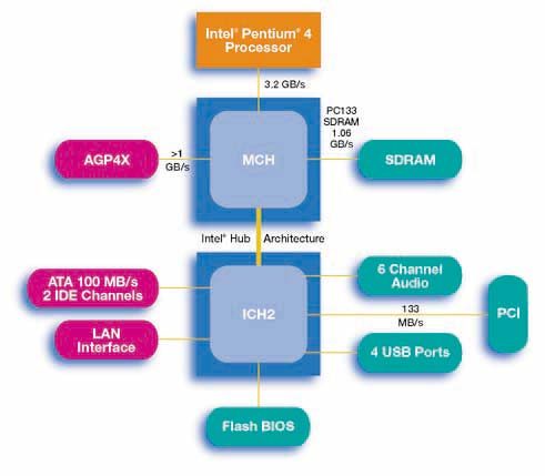 Структурно чипсет представляет из себя нечто весьма похожее на всю серию i8xx — фирменная Intel Hub Architecture с пропускной способностью 266 MBps, южный мост ICH2, одинаковый практически для всех современных чипсетов Intel, и северный, поддерживающий до 3 GB памяти (все-таки значительная подвижка вперед по сравнению с 2 GB у i850 и уж вовсе по современным меркам "убогими" 512 MB у i815xx). Для low-end чипсета, прямо скажем, более чем достаточные характеристики.
