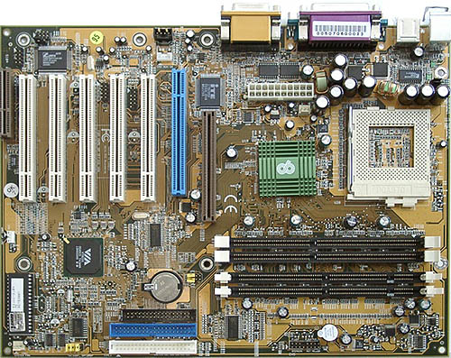 В результате плата выглядит монументально и кажется практически квадратной. Очевидно, что с левой стороны появилось огромное количество свободного места. Хватило места и для микросхемы ATA100 RAID от Promise, и для двух дополнительных IDE разъемов, и даже для того, чтобы разместить батарейку горизонтально. Но вот незадача — места-то хватило, а вот сам RAID не распаян.
