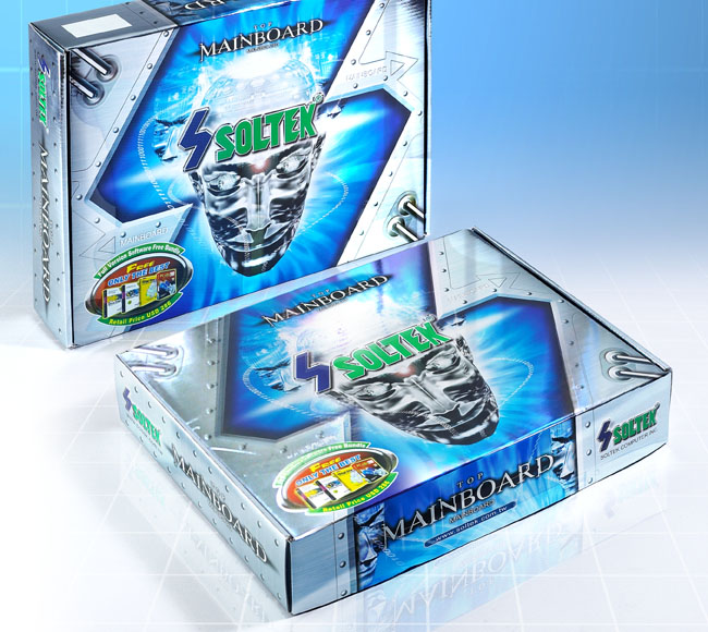 Если Вы интересуетесь кроссовками от ведущих фирм мира и сравните сегодняшние и те, которые были произведены года 2-3 назад, тенденции налицо. Во-первых, наибольшее предпочтение отдается блестящим, светоотражающим материалам, напоминающим металл, а во-вторых, материалы эти стали рельефными. Так и на волне веяний времени преобразились коробки, в которые упаковывает Soltek свои платы — они стали рельефными, а серый и синий цвета сменились на оттенки "металлик". Теперь несколько банальные коробки стали действительно яркими и привлекательными.