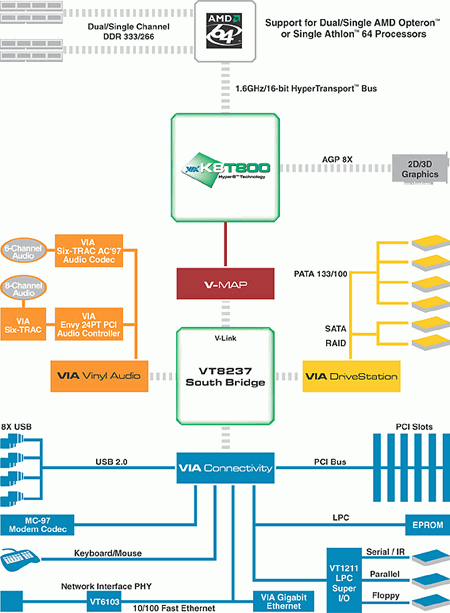 За время ожидания анонса процессоров Athlon 64 компания VIA успела не только подготовить линейку чипсетов для них, но и сменить ее на новую. Другие производители, однако, оказались не столь плодовитыми, так что к настоящему моменту на рынке реально присутствует всего два чипсета под Athlon 64  VIA K8T800 и NVIDIA nForce3 Pro. Тут надо сразу оговориться, что «в чистом виде» чипсетов под Athlon 64 не существует: все процессоры микроархитектуры K8 соединяются с [любым] чипсетом по выделенной шине HyperTransport, и для последнего не существует даже принципиального различия между сокетами/семействами CPU, которые можно установить на конкретную плату. Почему мы в таком случае оговариваемся насчет «под Athlon 64»? Дело тут не в технических характеристиках, а в позиционировании: первым реально вышедший на рынок чипсет AMD8000 ни одним из производителей пока не использован в материнской плате со слотом AGP. Надо ли пояснять, что в таком случае для более 90% домашних пользователей он неинтересен, а Athlon 64 ориентирован все же именно на эту группу покупателей (правда, не при нынешней своей цене).