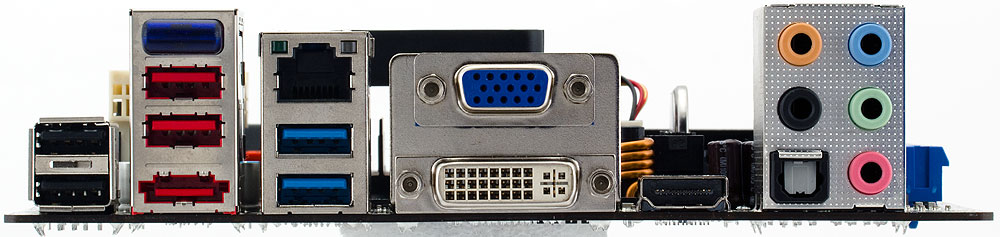 Задняя панель не оставляет желать лучшего, за исключением пары моментов. Во-первых, стоило бы добавить еще пару USB 2.0, потому что четырех может оказаться недостаточно (тем более что свободных осталось много — из 14 в чипсете используются только четыре сзади, четыре для вывода на переднюю панель и один для Bluetooth). Конечно, общее число портов USB на задней панели равно шести, однако порты USB 3.0 будут работать, только если соответствующий контроллер включен и для него установлены драйверы. Ну или можно было хотя бы разместить не обычный eSATA, а комбо-разъем USB/eSATA. В идеале же — сделать и то, и другое :) Иных нареканий нет. Зато конструкторов можно похвалить за ответственный подход к видеовыходам — в процессоре их три независимых, и именно три мы наблюдаем на задней панели. Не забыли аналоговый, который вполне может пригодиться, да и цифровые — как раз оба из наиболее распространенных: DVI и HDMI, а не все еще достаточно экзотичный (пусть и перспективный) DisplayPort.