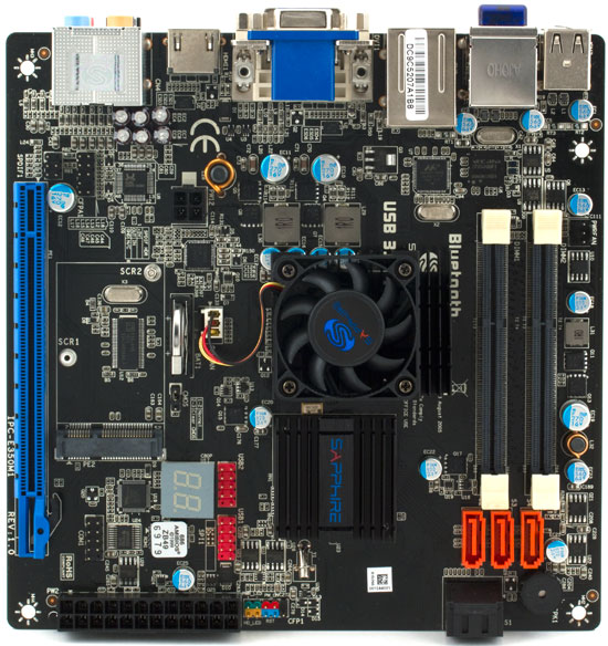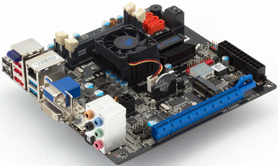 На первый (и не только) взгляд плата выглядит весьма знакомо и привычно, несмотря на использование новой платформы — мы постоянно встречаем подобные решения со времен Atom (в особенности — нового поколения). Процессор и чипсет расположены рядышком друг с другом, благо смысла разносить их на большее расстояние нет. Да и некуда особо :)