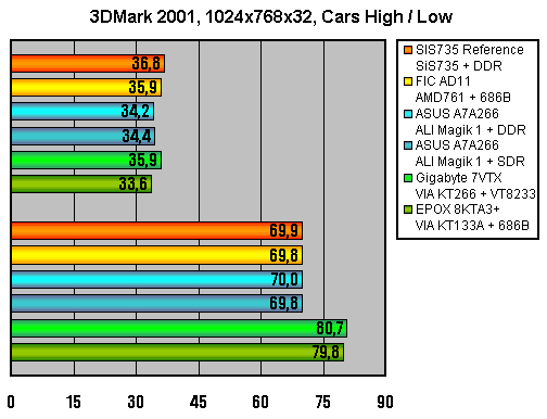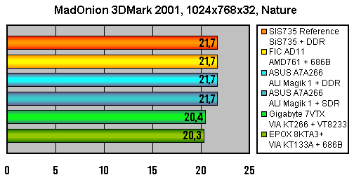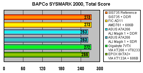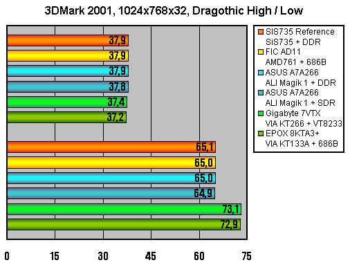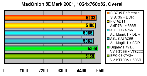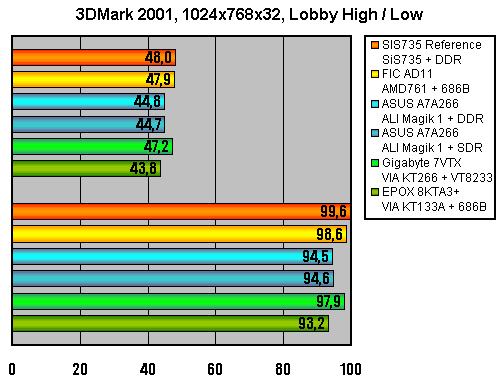 Легко заметить, что по общему баллу в 3DMark 2001 SiS735 опередил всех конкурентов кроме VIA KT266, однако отставание от последнего присутствует. Неужели застарелые болячки "альтернативного" (читай -- не-интеловского) AGP, которые совсем недавно подвели AMD760, свойственны и DDR-чипсету от SiS?