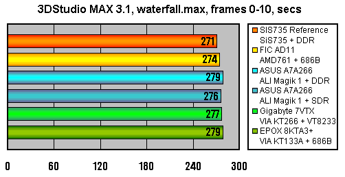 В тесте на рендеринг водопада в 3DStudio MAX 3.1 победа досталась SiS735. Небольшая (справедливости ради это имеет смысл уточнить), но все-таки победа. То есть по идее, мы в очередной раз должны остаться в недоумении. Но этого не произошло. Итак…