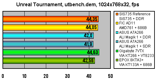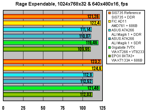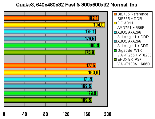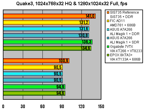 Ну вот, опять "все нормально" — SiS735 демонстрирует производительность, примерно сопоставимую с AMD760. Можно было бы сказать "как оно и следует из всех предыдущих результатов", но не будем забывать, что "следовать"-то следует, вот только не из всех :)